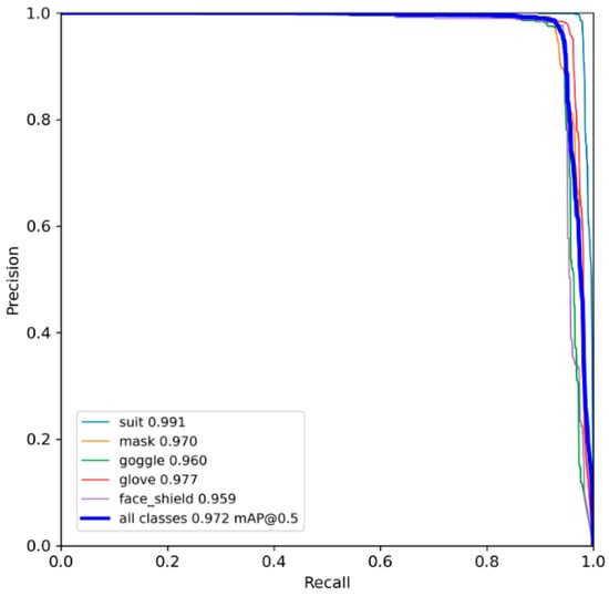 The mAP and PR curves are shown in Figure 9 and Figure 10, respectively. It can be observed that the mAP tends to increase as the training proceeds, while the PR curve is very smooth, with no spikes during the iterations. When reaching 300 epochs, the mAP tends to be stable. After completing 2000 epochs, the final training model is obtained.