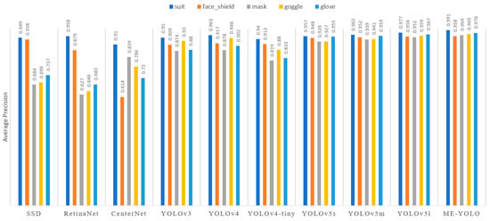 To verify the performance of this algorithm for medical personal protective equipment detection, nine other network structures—SSD, RetinaNet, CenterNet, YOLOv3, YOLOv4, YOLOv4-tiny, YOLOv5s, YOLOv5m, and YOLOv5l—were selected for comparative experiments. In this experiment, the mAP, F1-score, parameters, and FPS (frames per second) were used as the evaluation metrics for the above detection algorithm. The comparative results for performance metrics achieved by the ME-YOLO algorithm and its counterparts are shown in Table 4 and Figure 11.