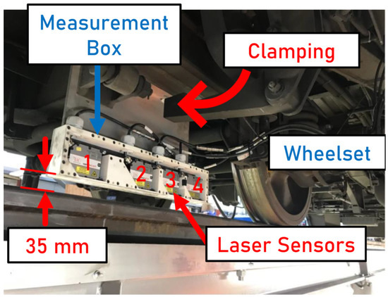 Experimental setup on the train with a measurement box, including four laser triangulation sensors (numbered 1 to 4) for distance measurements.