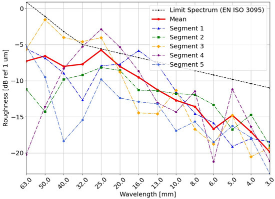 A measurement was performed on a section in front of the reference sections. The measurement was carried out at a mean speed of . This resulted in a data point distance of . Five adjacent segments with a respective length of were measured. The five spectra were averaged according to Equation (5) for each one-third octave band to a mean value. The spectrum of acoustic roughness for reference section B is given for qualitative comparison of the measurement result. The measured section was located before the reference section. There was a relevant longitudinal offset to the reference sections. When comparing the average from five individual segments with reference section B, the average deviation over the evaluated spectrum was . The deviation had a minimum value of at a wavelength of . The maximum deviation of occurred at a wavelength of . The average deviation for the wavelength range between and was . The spectrum of acoustic roughness for the measured section is shown in Figure 7. The spectrum of acoustic roughness for the measured section compared with reference section A is shown in Figure A3. The spectra of the five adjacent measurements used for the determination of the mean value are shown in Figure A6.