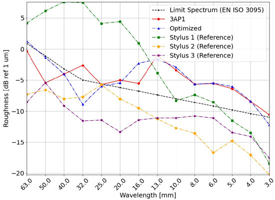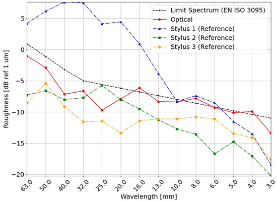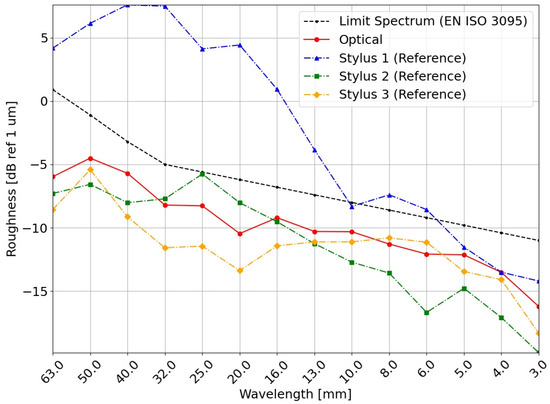 For the numerical comparison of the measured profile data with the reference measurements, the data from stylus 2 were used, as it was located in the center of the running surface. In addition, the profile data of styli 1 and 3 were evaluated to show a comparison for the shift in the lateral direction. The recorded profile data from the reference sections were processed in almost the same way as the data measured with the optical system. Instead of applying a pre-filter, the reference data were only detrended. The acoustic roughness was evaluated in the wavelength range between and due to the limited reference measuring length.