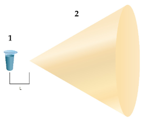 Experimental setup. Numbers indicate the main elements of the setup: (1) is the test tube with 0.1 µM HRP solution in 2 mM PBSD buffer, and (2) is the cellulose cone. The distance between the test tube and the cone apex is L = 2 cm.