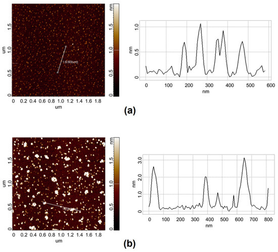 Typical AFM images (left) and cross-section profiles (right) of HRP biomacromolecules adsorbed onto mica. In the control experiment (a), the HRP sample was incubated at a >10 m distance from the cone. In the working experiment (b), the HRP sample was incubated at a 2 cm distance from the apex of the cone. The incubation time was 40 min. Scan size: 2 µm × 2 µm. Panels on the right show cross-section profiles corresponding to the lines in the images on the left.