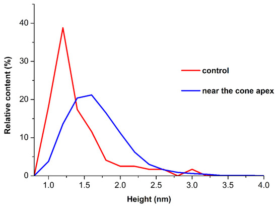 The AFM images in Figure 2 clearly indicate the enlargement of HRP particles on mica after the 40 min incubation of the enzyme sample near the cone apex in comparison with the control sample. In both the control and working experiments, compact objects with heights of 1 to 2 nm were observed on the surface. They can be considered HRP biomolecules, since such objects were not observed in the blank experiments. Moreover, for the samples incubated near the cone apex for 40 min, higher (up to 3 nm, Figure 2b, right panel) objects were observed. Furthermore, many of the mica-adsorbed particles were much more extended laterally in comparison with the control sample. The latter can be attributed to HRP aggregates. In contrast, at a shorter incubation time (10 min), there was no difference between the AFM images obtained for the control sample and the sample incubated near the cone.