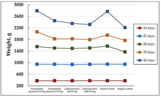 The additives obtained were used for the broilers’ feeds. Some kinds of additives, namely those which were based on the Y. lipolytica PO1f and PO1f (pUV3-Op) strains grown in the waste-containing medium, were added at a maximum dose of 1.2% w/w. This does not exceed the 3% maximal amount recommended for the mixed feed []. The specific phytase activity in the dried PO1f (pUV3-Op) additive was 0.25 FYT/g, so the phytase activity in the experimental group diets was 30 and 15 FYT/kg, i.e., 30–60 times less than the recommended one [,,,]. The Ladozyme Proxi commercial phytase was applied in doses of 100 and 1000 FYT/kg, which were slightly less than and twice as much as, respectively, the recommended dose by the manufacturer (500 FYT/kg). Table 4 and Figure 1 show the dynamics of the body weight of the broilers in the experimental groups.