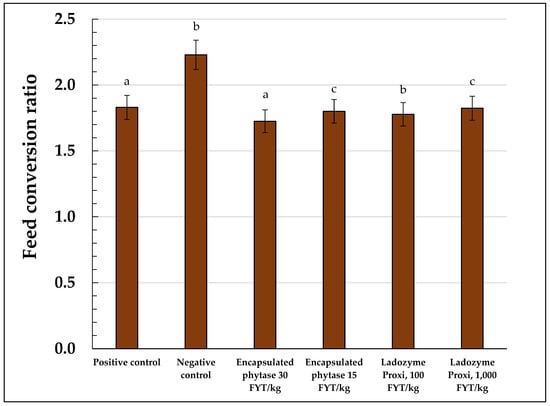 Feed conversion ratio (FCR) of the broilers in the experimental groups. a—p ≥ 0.05; b—p ≥ 0.02; c—did not differ significantly.