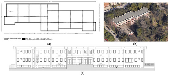 Case-study school building: (a) plan layout, (b) satellite view (Google Earth), and (c) longitudinal elevation.