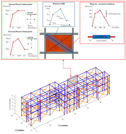 Case–study school building model in OpenSees [23] and illustration of the numerical modeling approach for masonry infill, frame elements, and beam–column joints.