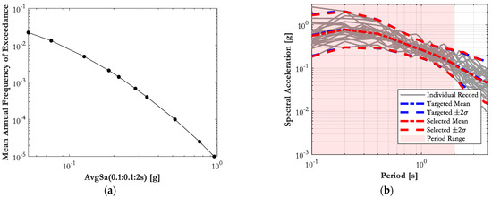 OpenQuake [27] was used to perform seismic hazard computations. The analysis is based on the SHARE Project [28] source model and the ground motion model proposed by Boore and Atkinson [29]. The hazard curve in terms of the spectral acceleration corresponding to the AvgSa (0.1:0.1:2.0 s) for the city of Ancona (Italy) [30,31] is shown in Figure 4a. A total of 25 pairs of ground motion records in two horizontal components were selected, for each of the ten intensity measure levels (IM levels), from the PEER NGA-West database [32]. For this purpose, any other ground motion record database, such as a European one [33], could have been used. Figure 4b illustrates the target conditional spectra (CS) for IM level 6 (close to Life Safety limit states (NTC 2018 [34]) for the site of interest, together with the 25 individual record spectra. More details on the record selection procedure are provided by Kohrangi et al. [30,31].