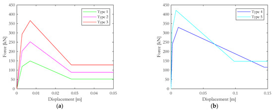 Backbone curves for (a) masonry infill types 1–2–3 and (b) masonry infill types 4–5.