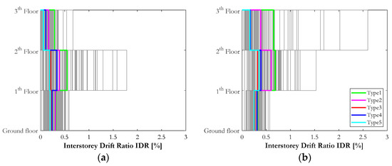 The higher values noticed for the MIDR at the first story were due to the structural characteristics of the buildings: the stiffness of this floor is quite lower than that below due to a reduction of the column cross sections along the building height.