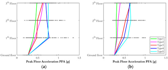 Median of peak floor acceleration (MPFA) profiles for the case study school building at IM level 6: (a) completely infilled configuration; (b) partially infilled configuration (X direction).