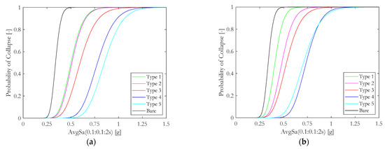 Collapse fragility curves for the case-study school building: (a) completely infilled and (b) partially infilled structural configurations.