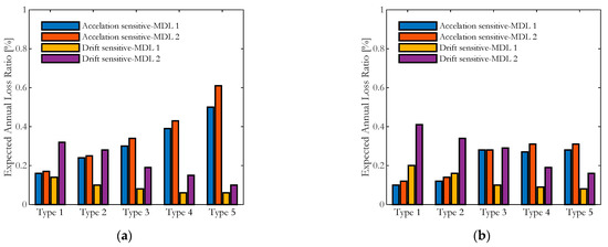 For what concerns the infilled frames (Figure 11a), when both drift and acceleration-sensitive components are considered, using the MDL-2 dispersion [16], the EALs are 1.3 to 1.6 times higher than those obtained with the MDL-1 dispersion [11], with the lowest difference occurring for strong masonry infills (type-5). The EAL always increases when going from weak to strong masonry infills. When the presence of openings is accounted for (Figure 11b), the same MDL-2/MDL-1 EAL ratio increases to the range of [1.3–1.8]; on the other hand, for the case completely infilled, no particular trend for the total EAL, as a function of the macro-classification of the infills, is observed. This could be due to the reduction of stiffness and strength, which is used to account for the presence of the openings, leading to a different structural response of the building when compared with the uniformly infilled typology.