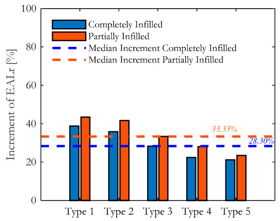 Finally, to further gauge the effects of modeling uncertainty on the loss estimation, a disaggregation in terms of drift- and acceleration-sensitive components was performed. The results are provided in Figure 12, in which the outcomes obtained using MDL-1 and MDL-2 are compared. The disaggregated results show, firstly, that for weak (type-1) and weak to medium (type-2) masonry infills, the major contribution to EAL is given by drift-sensitive components, and, therefore, the MDL-2 EAL for drift-sensitive components is much higher than that of MDL-1. Secondly, increasing the stiffness of the masonry infills, the difference between MDL-1 and MDL-2-based EALs is much lower for drift-sensitive components. Conversely, the impact of the higher-dispersion MDL-2 is quite notable, especially for medium and strong masonry infills, on the losses related to acceleration-sensitive components, with respect to MDL-1. In turn, for acceleration-sensitive components and weak (type-1) and weak-to-medium (type-2) masonry infills, the differences between MDL-1 and MDL-2 are negligible for both structural configurations. Finally, the impact of different dispersion values and the reduction coefficient of the median intensity is quantified in Figure 13. The median increment of the EAL ratio, with respect to the MDL-1 values, is 28% and 33%, without and with openings, respectively.