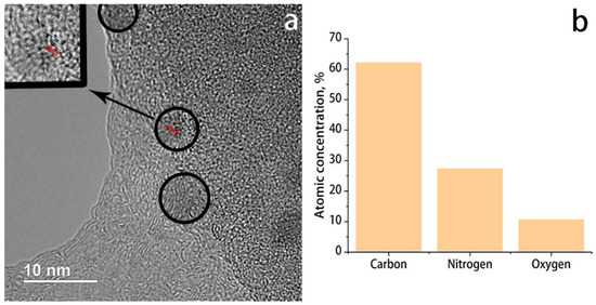 As can be seen from the presented image, the synthesized nanoparticles are about 7 nm in size. The lattice fringes are clearly visible (Figure 1, inset, red lines) with the lattice parameter around 0.189 nm that corresponds to the (102) lattice fringes of graphite.