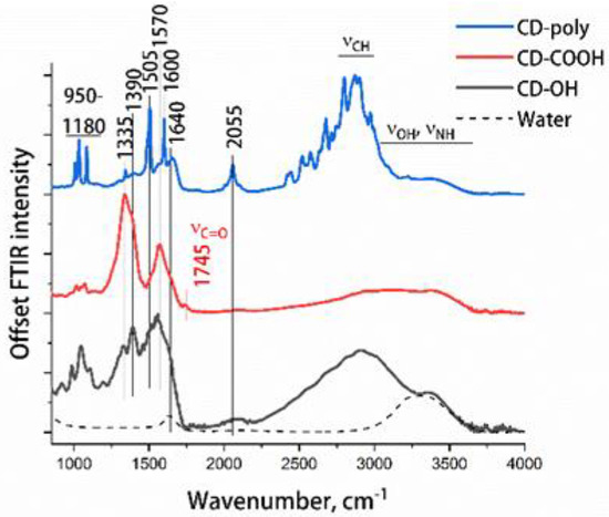 The IR absorption spectra of three CD samples contain a similar set of bands that differ in relative absorption intensity. In the region of 3000–3700 cm−1, there is a wide band caused by stretching vibrations of the surface hydroxyl and amino groups and OH groups of water molecules adsorbed on the surface of the samples. The relative intensity of this band for CD-poly and CD-COOH is significantly lower than for CD-OH. In the region of 2800–3000 cm−1 there are bands of stretching vibrations of CHx groups. In the region of 2055 cm−1, there is a band that presumably belongs to overtones/combinations of various vibrations in CDs [36].