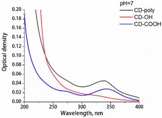 The optical extinction spectra of aqueous solutions of CD-poly, CD-COOH, and CD-OH were obtained on a Shimadzu UV-1800 spectrophotometer in the wavelength range of 190–1100 nm with a resolution of 1 nm. The informative part of the obtained spectra is shown in Figure 3.