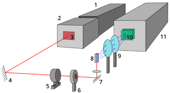 Scheme of the experimental setup for the study of CDs’ UCL: 1—pulsed nanosecond Nd:YAG laser; 2—parametric light generator; 3—light filter KS-11; 4—rotatory mirror; 5—power meter; 6—mechanical shutter; 7—rotatory mirror and lens; 8—cuvette with the solution of nanoparticles; 9—optical system of two lenses; 10—light filters SZS-22 and SZS-23; 11—registration system consisting of a monochromator and a CCD camera.