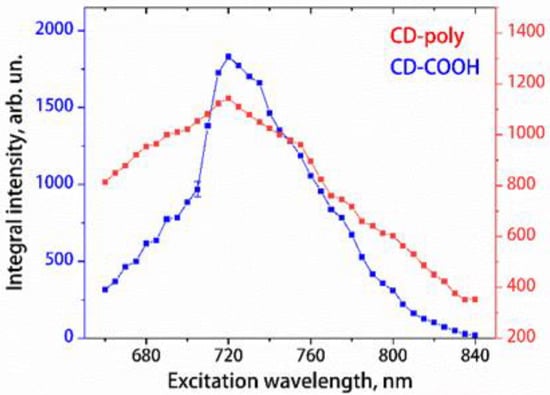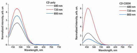 It can be seen from the obtained results that the maxima of the dependences of the UCL integral intensity on the wavelength of the exciting radiation for the two types of CDs are close and are in the region of 720 nm (Figure 6). Therefore, this excitation wavelength can be considered optimal for both types of CDs, and it was used for the excitation of the CDs’ UCL in following measurements. The proximity of the excitation wavelengths that provide the maximum integrated intensity of UCL of CD-COOH and CD-OH is explained by the same adsorption features of these CDs’ solutions related to their functional groups (Figure 3). Nevertheless, it should be noted that, upon excitation of UCL by radiation at a wavelength of 720 nm, the UCL intensity of an aqueous solution of CD-COOH is approximately 1.7 times higher than that of an aqueous solution of CD-poly at pH = 11.7. Thus, the presence/absence of CDs’ UCL and its characteristics depend on the functionalization of the nanoparticle surface.