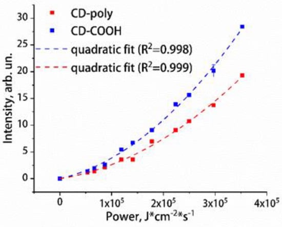 As discussed earlier, according to some photophysical models, the UCL of CDs is due to a two-photon absorption process. In this case, the CDs’ UCL integrated intensity should depend quadratically on the power of the exciting radiation.
