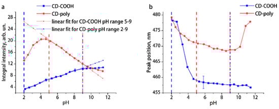 Dependence of the integral intensity (a) and the position of the maximum (b) of the UCL spectra of aqueous solutions of CD-COOH and CD-poly on pH. The vertical lines represent the pH limits of applying the linear fit to UCL intensity vs. pH.