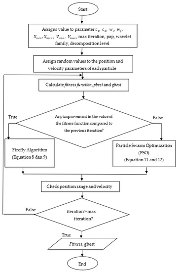 Figure 1 provides a flowchart of the wavelet family and the level of decomposition optimization using the FAPSO algorithm. The parameter values for the PSO and FA hybrid algorithm set in this study are presented in Table 1. The parameters used are based on the parameters set in [43].