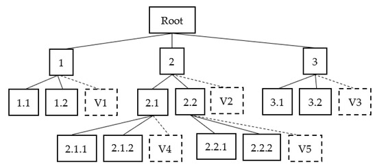 In Figure 3, virtual nodes are built on the internal nodes of the hierarchy except the root node. V1, V2, V3, and V4 are virtual nodes. These nodes are connected to the parent node using a dashed line to indicate that this node does not belong to the child node of the parent node. For example, class 1 has training data from classes 1.1, 1.2, and a virtual class, V1. This virtual class V1 contains training data from class 1’s sibling nodes 2 and 3. Class 2 contains training data from classes 2.1, 2.2, and virtual class V2. This virtual class V2 contains training data from class 2’s sibling nodes 1 and 3.
