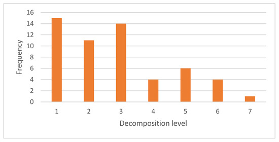 Figure 6 depicts the frequency of decomposition levels to represent protein classes. In total, 15 of the 55 wavelet families used decomposition level 1, the highest level of decomposition used in feature representation. Decomposition level 1 yielded 85 approximation and 85 detail coefficients, accounting for half of the 170 PseAAC features. Decomposition level 1 preserved global and local information. Decomposition level 3 was used by 14 wavelet families. Decomposition level 2 was used by 11 wavelet families. Four wavelet families used level decomposition 4, six families used level decomposition 5, and four families used level decomposition 6. Decomposition level 7 was the fewest decomposition level chosen for the feature representation, with only one. A higher level of decomposition increases the number of detail coefficients while decreasing the number of approximation coefficients. This means that the protein class required more local information to represent it than global information.