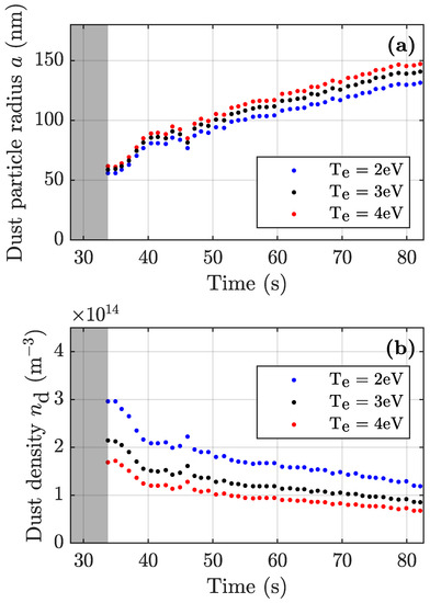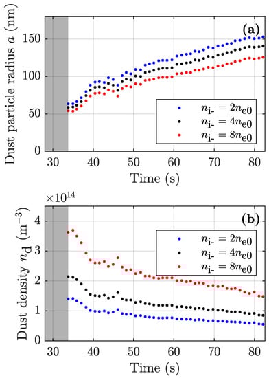 - Killer, C.; Mulsow, M.; Melzer, A. Spatio-temporal evolution of the dust particle size distribution in dusty argon rf plasmas. Plasma Sources Sci. Technol. 2015, 24, 025029. [Google Scholar] [CrossRef]