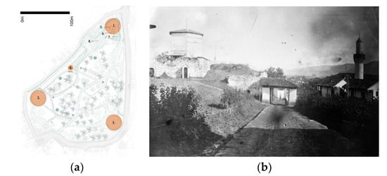 Details of city fortress. (a) Scheme of the facilities of the City Fortress—Actual state: 1—Northern Tabia; 2—Western Tabia; 3—Southern Tabia; 4—Tower Motrilja; 5—Tower Dzephana; 6—Gunpowder tower–Bartuthana; 7—Zindan; 8—Modern-day Library. (Drawing design: Lejla Zećirović). (b) Entrance into the Fortress (Photo source: Tower Dzephana, 1916, private archive of Vladan Vidosavljević).