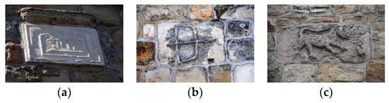 Decorative rosettes on the walls of the Fortress and in buildings, symbols that drive enemies away from the Fortress (a–c) (Photo source: private archive of Vladan Vidosavljević).