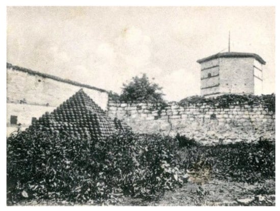 In 1916, a chapel was built for the needs of Austro-Hungarian soldiers on the site of the destroyed mosque. After the Second World War, the fortress was turned into a city park, the landscaping of which led to the mixing of cultural layers in its interior. The Tabias were conserved, and major conservation interventions were also carried out on the Tower Motrilja. The only building of the fortress that had and still has a purpose was the southern Tabia, where restaurant adaptations and summer garden landscaping were carried out on the plateau (unfortunately, without the prior consent of the protection service). A summer garden was also set up on the northern Tabia, which underwent conservation efforts once again in 2012 through a first place finish in a competition called “The place I love”, financed by Bank Intesa []. The thickness of the rampart walls is 1.30 m with the thickness increasing to 1.50 m in some parts. On the top of the ramparts, there were walkways and shooting ranges with spikes to protect the shooters. The fortress trench was dug around the city wall as an obstacle to invaders. it was dry and could be filled with water []. The fortress was the most visible facility in the urban structure of the city, elevated in relation to the bed of the Raska River, and very significant in terms of its historical position. This building received the status of fixed cultural assets of great cultural importance in 1979 [].