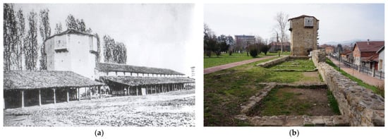 Tower Motrilja. (a) Archive photo—Tower Motrilja in 1918 (Photo source: private archive of Vladan Vidosavljević). (b) Present state of the tower with the remains of the Turkish barracks from the period of Abdul Aziz’s reign (Photo source: private archive of Vladan Vidosavljević).