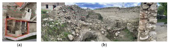 Excavation of the dungeon. (a) Aerial view of the site. (b) Present state of the remains of the dungeon (Photo source: Lejla Zećirović).