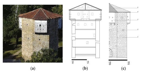 Tower Dzephana. (a) Tower Dzephana before the demolition, called Ahmed Aga’s tower (It is assumed that he rebuilt it) (Photo source: private archive of Vladan Vidosavljević). (b) Cross-section of the tower Dzephana—proposal. (c) Detail of the materialization of the façade—proposal (Drawigns: Lejla Zećirović).