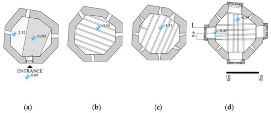 Some buildings have been partially or completely demolished over time, as a result of war and partly as a result of various natural disasters (earthquakes, floods, etc.), as is the case with the Tower Dzephana. Archaeological excavations carried out at the Fortress in 2020 revealed a hexagonal building of smaller dimensions at the base, next to the northern Tabia of the fortress (Figure 23 and Figure 24). The tower must undergo an invasive structural restoration technique and rebuilding of its walls. Levels 1–3 of the proposed measures and costs can be found in Section 5.3.