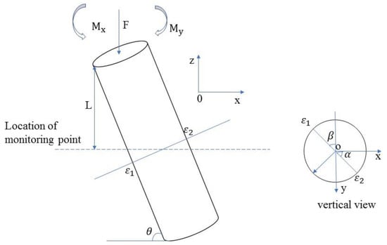 It is also necessary to determine the change in the load at the top of the conduit leg to obtain the change in the load at the pile foundation . The stress model of conduit leg is shown in Figure 3, in which: is the load on the top of the conduit leg; and are the bending moments in the x and y directions, respectively, at the top of the leg; is the included angle between the conduit leg and the x–y plane; and and are the included angles between the diameter of any section position and the two coordinate axes, which can be obtained by the knowledge of material mechanics.