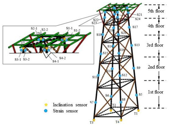 Based on the monitoring objectives, inclination sensors, strain sensors, linear polarization resistance probes, electrical resistance probes, and many other sensors are used. Because of limitations of space, only those sensors considered in the present work are shown in Figure 5. The principle of the layout the GPS stations is to set them at the center point of the platform and the open field of vision on the axis. The system is equipped with a total of eight inclination sensors (T1–T8): one at the top and one at the bottom of each of the four main pipes. The strain sensors (numbered S1-1, S1-2, S2-1, S2-2, S3-1, S3-2, S4-1, and S4-2) are divided into two types of location: the midpoints of each guide-leg rod layer, and at the top of each guide leg. Of these, four groups of strain sensors are set at the top of the four guide legs, and each group contains two strain sensors; their wires pass through the centers of the guide-leg sections.
