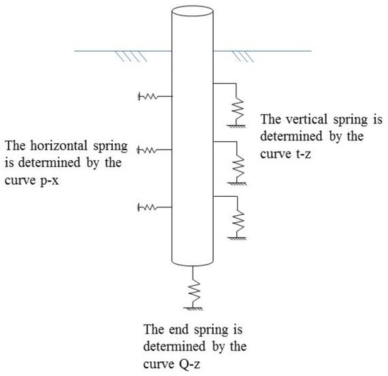 In practice, the constraint conditions of the piles and soil will be changed by external factors, and this boundary is an important factor causing changes in the structural frequency. Therefore, it is of great significance to adopt appropriate boundary conditions. As shown in Figure 7, the soil reaction of a pile in the API specifications is divided into axial and lateral components to describe the establishment of the finite-element model under pile–soil interactions. The axial soil reaction includes the axial-transfer load reaction and the pile-tip load reaction. The horizontal spring constant is determined by the p–x curve, the vertical spring constant is determined by the t–z curve, and the end spring constant is determined by the Q–z curve [].