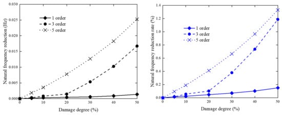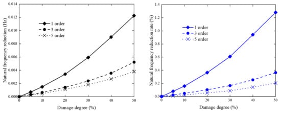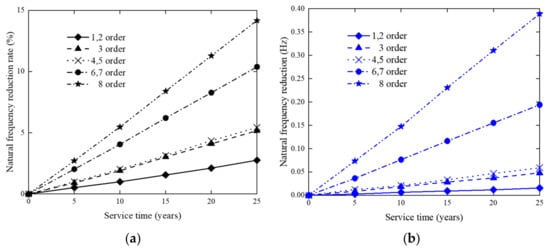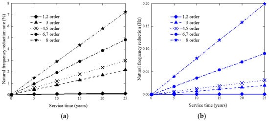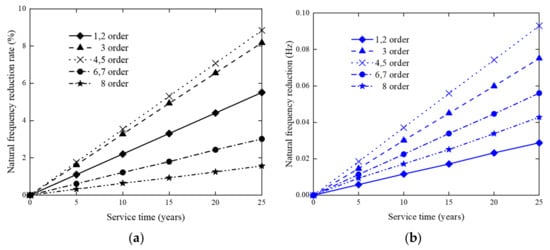 The diagram of time-varying effect on frequency under corrosion is shown in Figure 12. It denotes that the platform frequency generally decreases with the increasing of service time. Within the service life, the effects of corrosion on the frequency are 1–10%, so corrosion also has a greater impact on the lower-order modes.