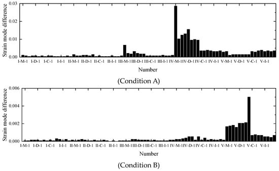 Based on the finite element model, analyzing the position corresponding to the mutation of the strain modal difference before and after the case damage in Table 5 to locate the damaged bar, and the magnitude of the amplitude can reflect the degree of damage. The first-order strain modal shapes of all bars before and after damage are plotted. Because of limitations of space, only the first-order strain difference diagram of 50% damage of the member were shown in Figure 10. We can see that first, compared with other layers of members, all members in the damage layer have more prominent and obvious changes in strain modal. Second, in the damage layer, the strain modal of the damaged member changes more sharply than that of other members, so the strain modal can not only locate the damage layer, but also accurately locate the damaged member.