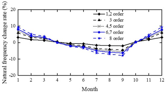 For simplicity, we divided the months seasonally, taking March, July, September, and December as being representative of the four seasons and observed the change rates of the low-order (1st–3rd order) natural frequency components corresponding to these months. From this analysis, we can see that the change range of low-order frequency components is 0–5%, and the change range of high-order (4th–8th) frequency components is 0–8%.