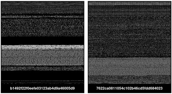 Two examples of Android malware converted into grayscale images: in detail on the left, a sample belonging to the Mecor family, while on the right, a sample obtained from the Airpush family.