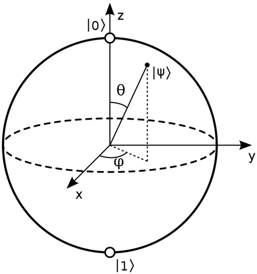Mathematically, a qubit can be seen as a unit vector described in a two-dimensional complex Hilbert vector space . To represent a complex vectorial space, the use of the notation of Dirac is opportune. It is also possible to obtain the qubit visual representation using the Sphere of Bloch. In that, we can imagine that all possible states are placeable on the surface of a sphere of unit radius, where the two poles represent the two fundamental states, respectively. Starting from Figure 2, it is possible to establish a bi-univocal correspondence between the representation of a generic qubit state: