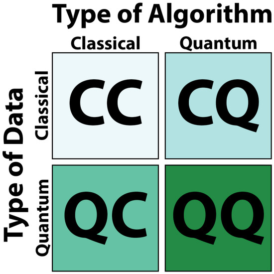 In [29], the authors conducted research in which they distinguished four ways to combine quantum computing and Machine Learning. There are several approaches to applying quantum principles. Those methodologies are reported in Figure 3 and differ on whether the data are generated by a Quantum (Q) or Classical (C) system and if the information processing device is Quantum (Q) or Classical (C). Briefly, In summary, case CC refers to classical data treated conventionally, case CQ employs quantum computing to process classical datasets, and case QQ uses quantum data processed by a Quantum Computer. In this paper, we focus our attention on quantum data processed by classical algorithms (i.e., QC). The quantum Machine Learning algorithms can be a quantum version of conventional ML or a completely new algorithm that addresses a classical problem in a quantum scenario. However, also hybrid classical–quantum methods can be used, where parts of the process, usually computationally expensive ones, are assigned to QC. The aim is to combine quantum and classical algorithms to obtain higher performance and decrease the learning cost. One more classification can be performed on the type of input data, which can be encoded with classical or quantum representation; thus, also the data type generates more hybrid approaches between the classical and quantum worlds.