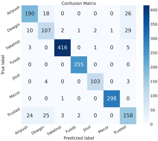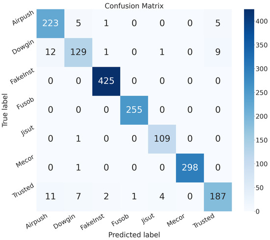 In Figure 6, we report the confusion matrix obtained from the Standard-CNN model. In that, we can see that the Deep Learning model produced a small number of misclassifications. The higher number of items classified incorrectly was for the Airpush family, with 11 samples classified as Trusted. The confusion matrix obtained after the execution of the Hybrid-QCNN model is shown in Figure 7.