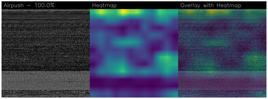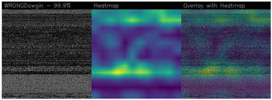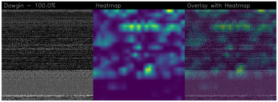 In Figure 8, we can see the detection of a sample belonging to the Airpush family with a high precision of 100%. As is possible to see, the most significant area is at the top of the image. In fact, there, the pixels are overlayed with the yellow shadow, while other parts of the image do not appear to be very important to classify the malware. As is described in Section 4, the models can make mistakes in terms of identification. Figure 9 show the wrong classification of malware belonging to the Airpush family recognized as a member of the Downgin family with an accuracy slightly less than 100% (99.9%).