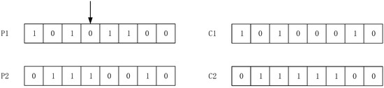 As shown in Figure 2, P1 and P2 on the left represent two individuals of the parent. A point is randomly selected from the two parent chromosomes (the part indicated by the arrow in the figure) as a crossover breakpoint, and the part after the point is exchanged to obtain two different offspring chromosomes C1 and C2, on the right side of the figure.