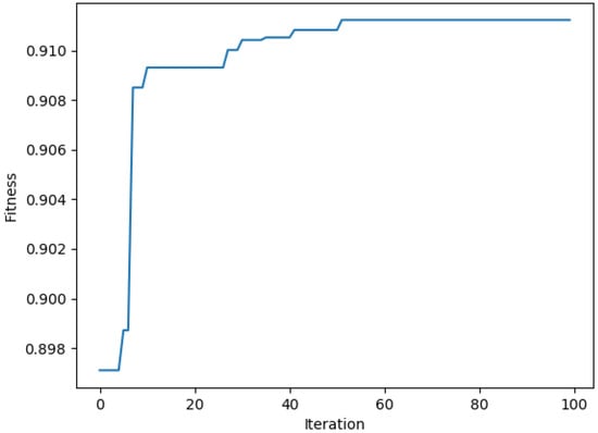 The experimental results show that a total of 20 features are selected as F2 = {f1, f2, f3,..., f20}, including the number of reserved characters, the number of other characters, the number of numbers, the maximum length of continuous letters, the maximum length of continuous numbers, the quantitative relationship between ‘?’ and ‘=’, the quantitative relationship between ‘=’ and ‘&’, the total length of the domain name, the domain name series, the longest string length of the domain name, the number of numbers in the domain name, whether the path contains the domain name, the path series, the ratio of the longest path to the path length, whether the file name contains more than two levels of extensions, the maximum length of the sub-path, the conversion frequency of numbers and letters in the URL, the proportion of vowel–consonant characters in the URL, the proportion of number characters in the domain name to the domain name, and whether the top-level domain name is five domain names. Figure 3 shows the optimal fitness value of each generation selected during the evolution process. Through 100 iterations, the final fitness of the new generation population reached 0.91.